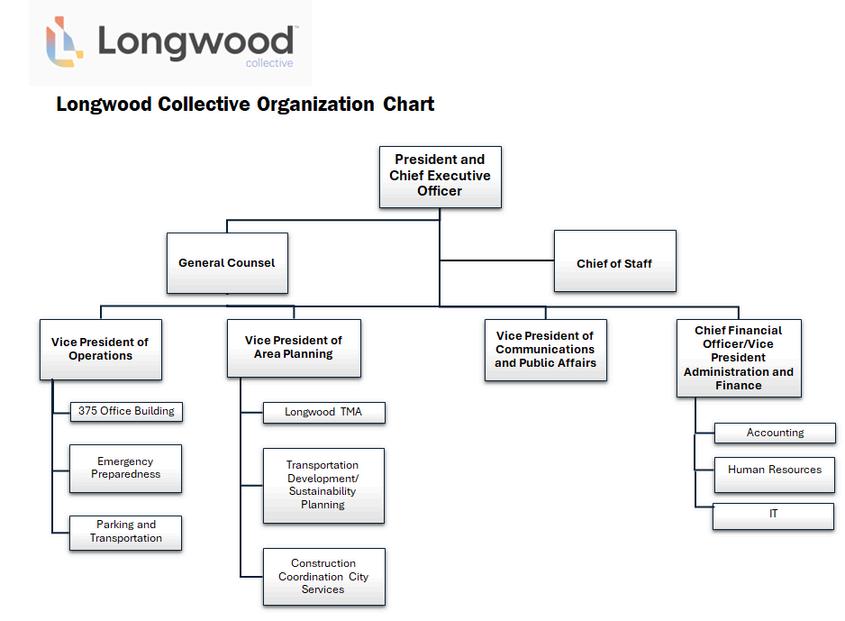 Longwood Collective’s executive leadership team and 64 FTE workforce* is overseen by a President and CEO supported by Vice Presidents of Finance and Administration/CFO, Area Planning and Development, Operations, and Communications, as well as General Counsel, Chief of Staff, Controller, and the Directors of IT, HR and Telecommunications/Call Center Operations.