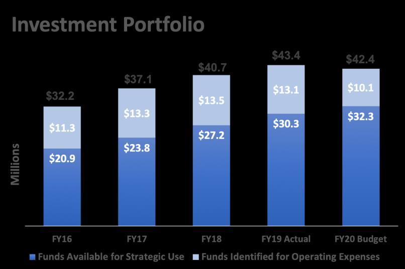 MASCO’s investment portfolio grew to $43.4 million at the end of FY19; exceeding the FY20 budget These funds have no restrictions. Per the request of the Finance Committee, MASCO identifies 200 days of annual operating expense. Amounts exceeding this level are available for strategic projects. For FY19, this amount is $30.3 million. Additionally, investment income continues to provide a portion of MASCO’s overall return.