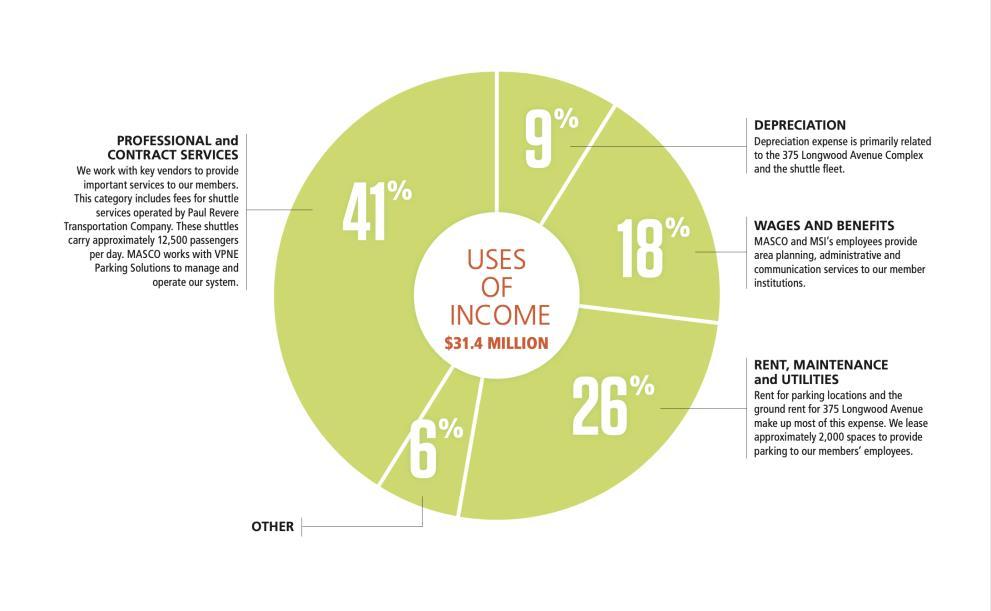 Professional and Contract Services: MASCO works through key vendors to provide important services to members. Expenses include fees for shuttle services operated by Paul Revere Transportation Co. Shuttles carry 12,500+ passengers per day. MASCO works with VPNE Parking Solutions to manage & operate the system.