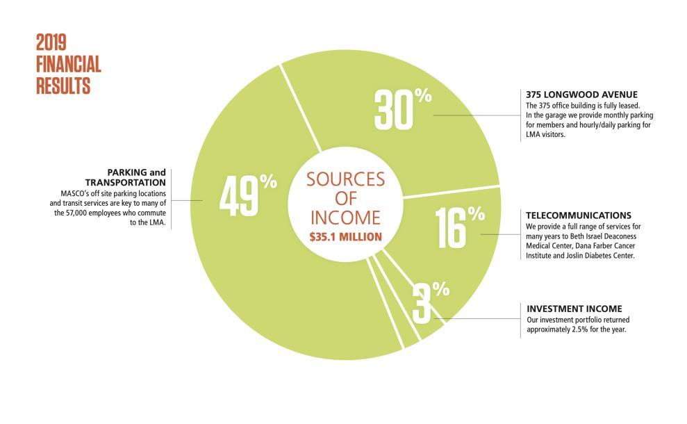 MASCO ended FY19 with $59.5 million in net assets and is budgeted to continue its steady 10-year growth. MASCO’s balance sheet also includes debt of approximately $6.5 million which is the balance remaining on a taxexempt lease used to finance the MASCO shuttle fleet. Additional long-term commitments total $13 million and include agreements for offsite parking locations and the 375 Longwood Avenue ground lease.