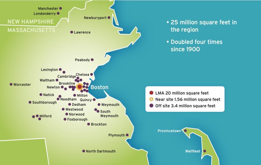 While MASCO has historically focused its efforts on the LMA, it has had to keep pace with the evolving needs of its members, many with services that have expanded geographically from Provincetown to Worcester to southern New Hampshire. Outside of the LMA proper, another 1.56 million square feet of space is leased or owned within one mile of the area, with facilities in Fenway/Kenmore, Brigham Circle, Brookline Village, Crosstown and Coolidge Corner; and more than 3 million square feet of academic campuses and healthcare facilities are leased or owned off-site (beyond 1 mile).