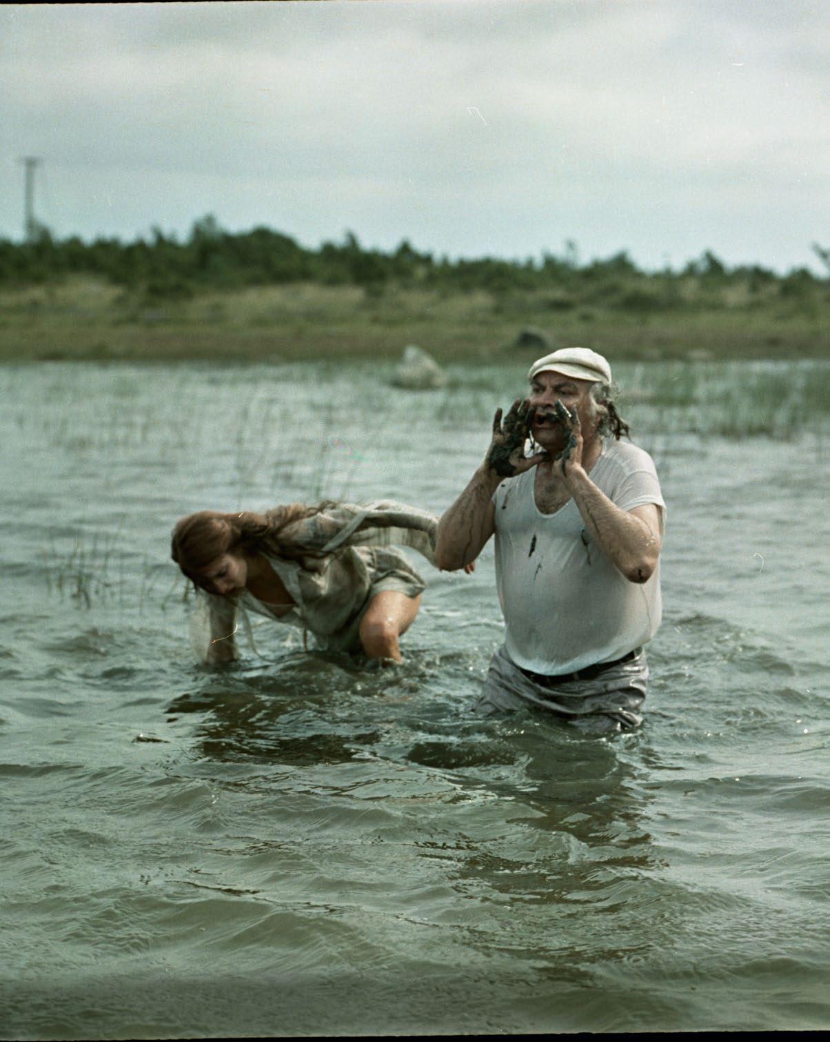 There’s an inevitable stumbling block in the script of Corrida – nature, and the animalistic, wild impulse. In the book, a herd of bulls running around the lonely island unchecked is a force majeure that arrives as suddenly as the storm, the night, or everything combined, as Neuland has emphasized. The arrival of the animalistic impulse, together with the base elements like fire and water, signifies a higher intervention, possibly punishment, but also presents a challenge to handle the issue at hand. This handling implies remorse, purification, and renewal. Osvald goes through that katharsis up to the point where he chases the bulls himself, having declared war on them. You could see that Neuland has tried to single out one bull, a true alpha male who Osvald would go against and fight with (for Ragne). However, these attempts remain weak, the animals don’t seem to have much animosity towards the film crew. They rather come near the camera in hope of getting bread or some other tasty treat, and the audience needs to evoke the necessary fear themselves. Peep Pedmanson wrote: “In the bull herd, physical danger can only be sensed with a really good imagination.”2 It’s true that conflict with the animals might also be interpreted as imaginary, and amplified by Osvald who tries to revive his fading masculinity in