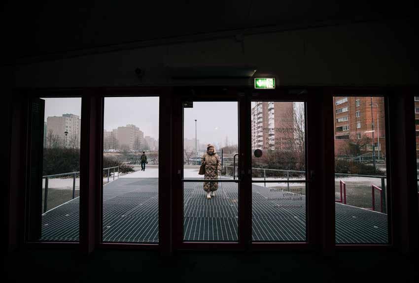 Kunst pakub lohutust halli argipäeva eest. Üksik külastaja Tallinna Kunstihoone ajutise Lasnamäe paviljoni ees.