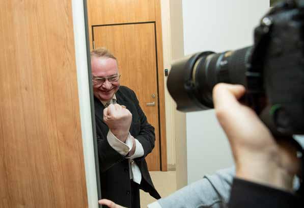 Among those involved in the scandalous savings and loan association ERIAL, Robert Hirvi was acquitted in the charges of helping to forge documents. He gestures to the prosecutor in the hallway of the court to celebrate the decision. At the same time, the association’s ringleaders were convicted of large-scale embezzlement, inciting to embezzlement, and aiding and abetting embezzlement.