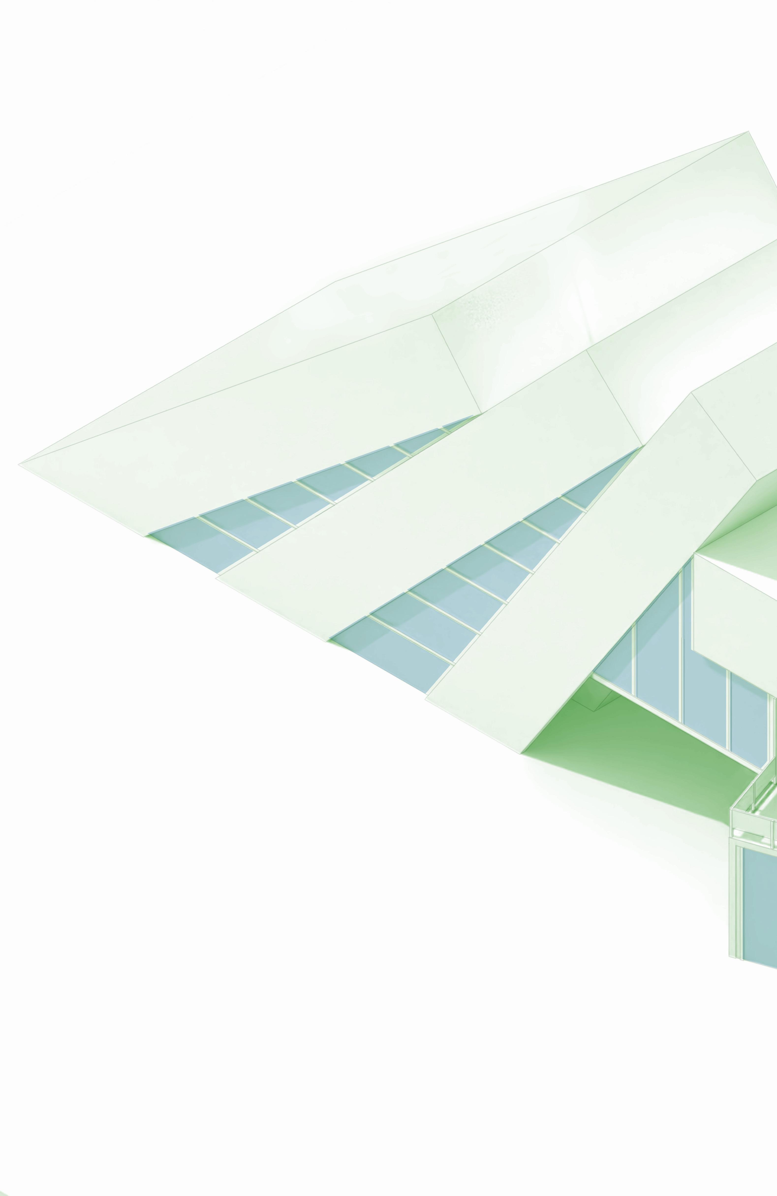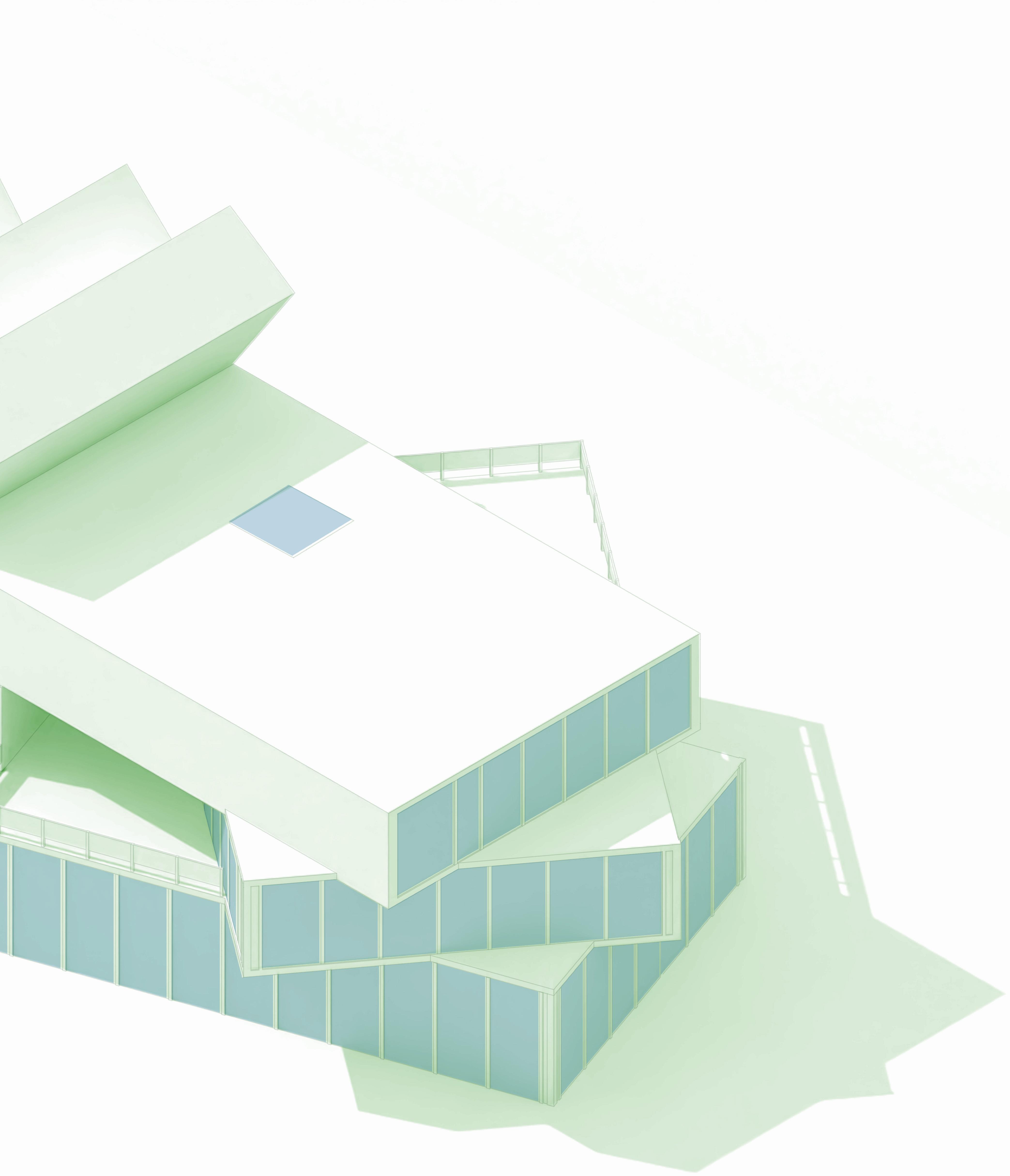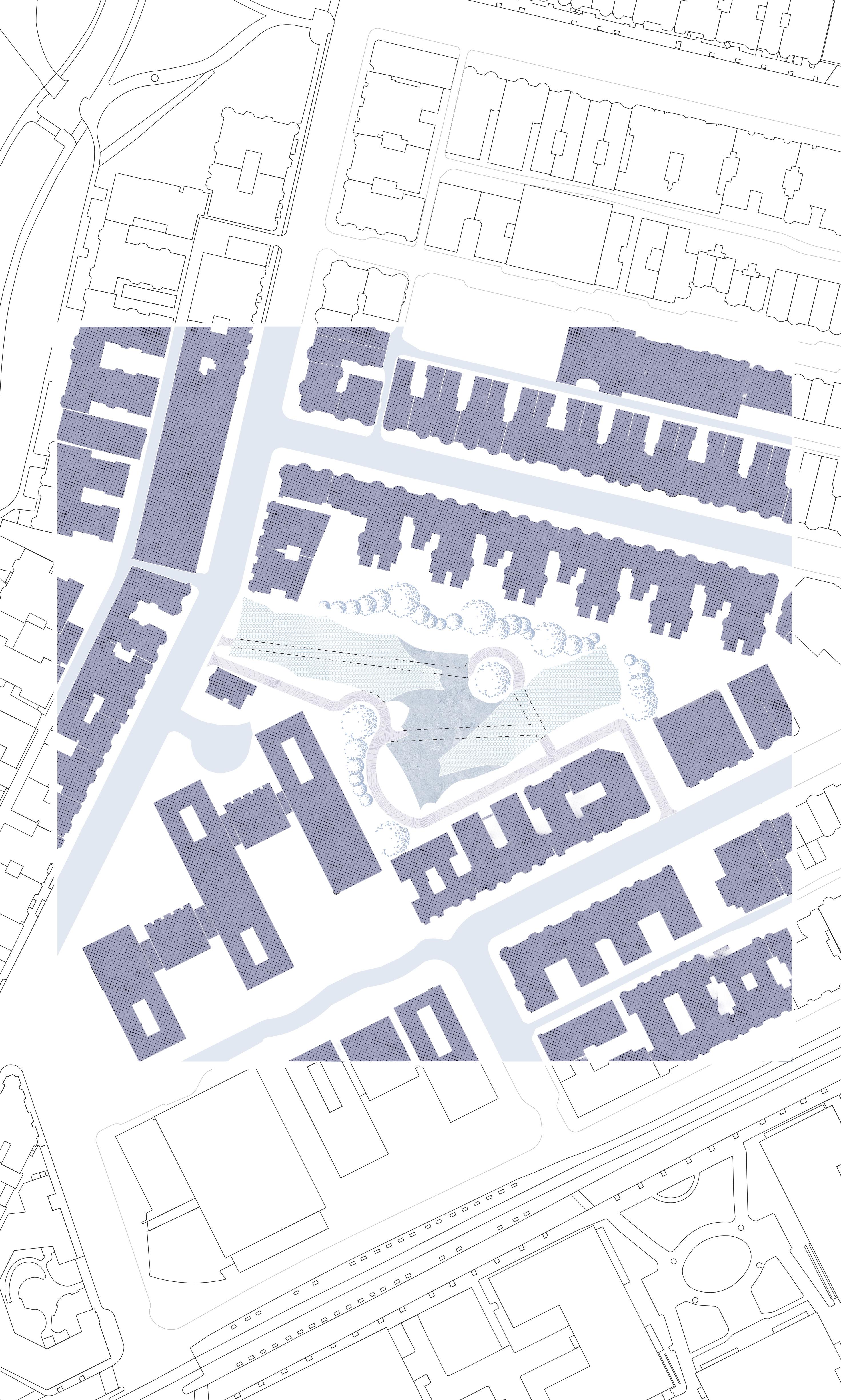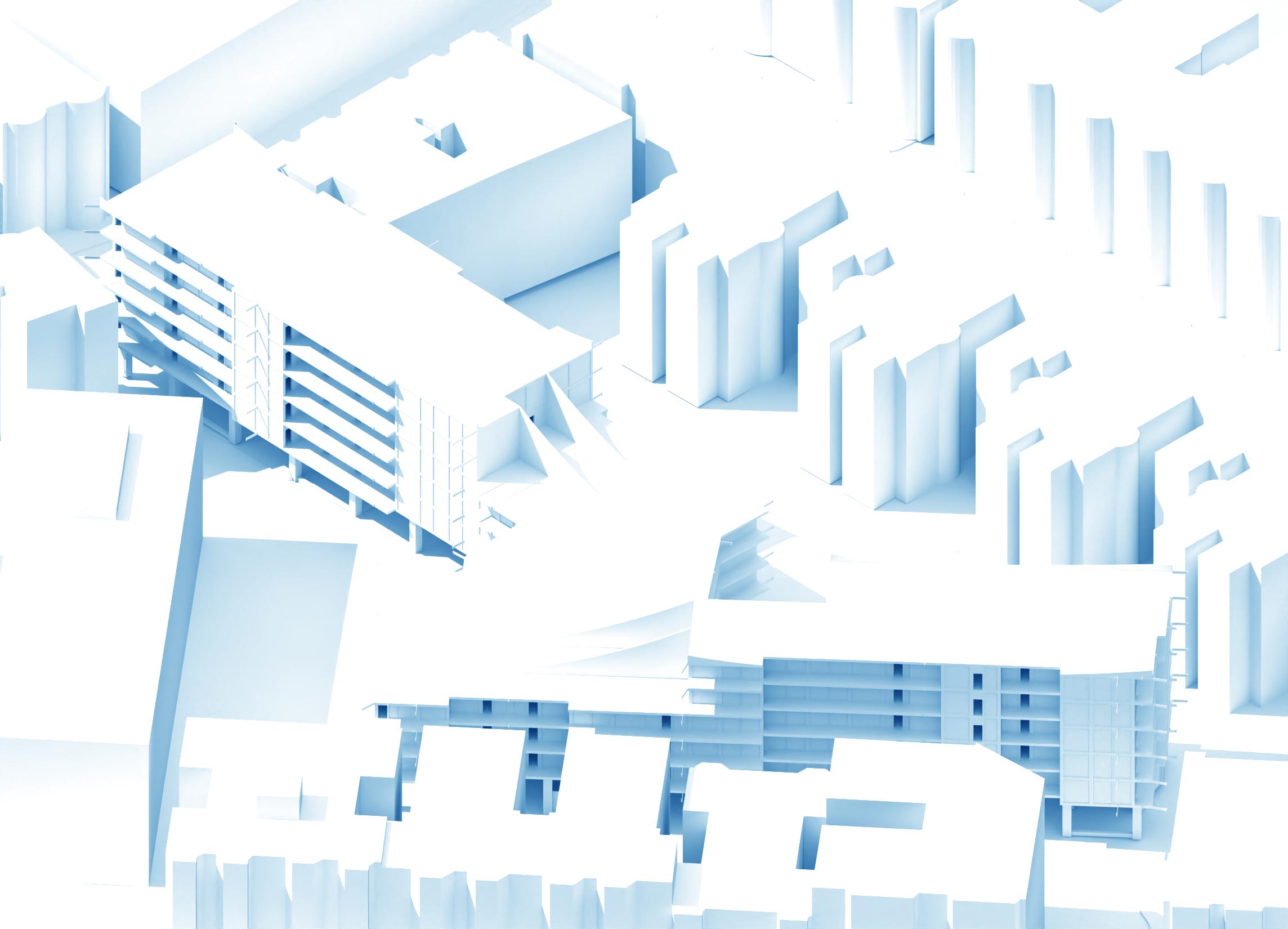 Axonometric Drawing. Higher elevations on edges create strong facades on street openings Mesh creates contrast between ridigity and fluidity