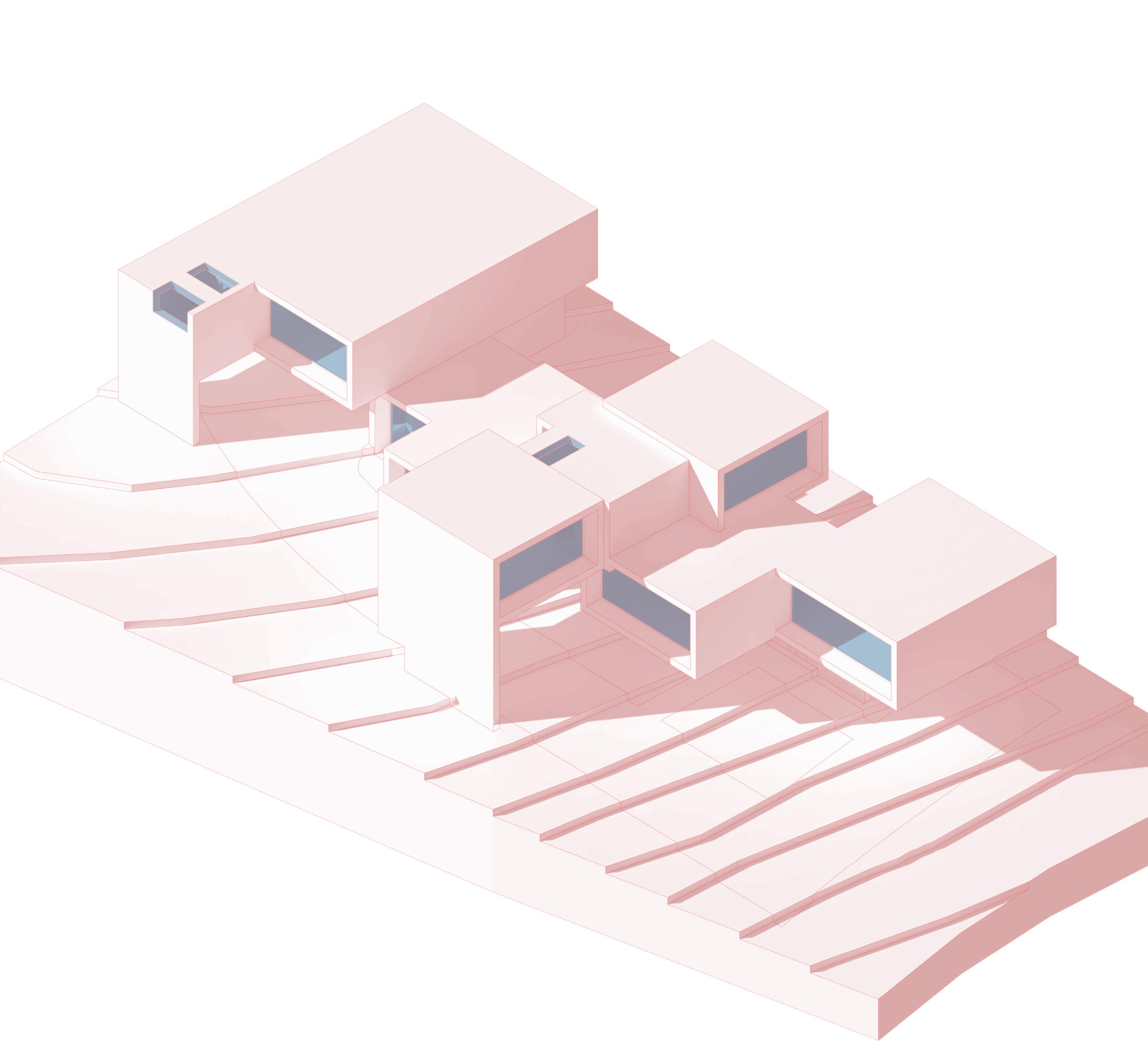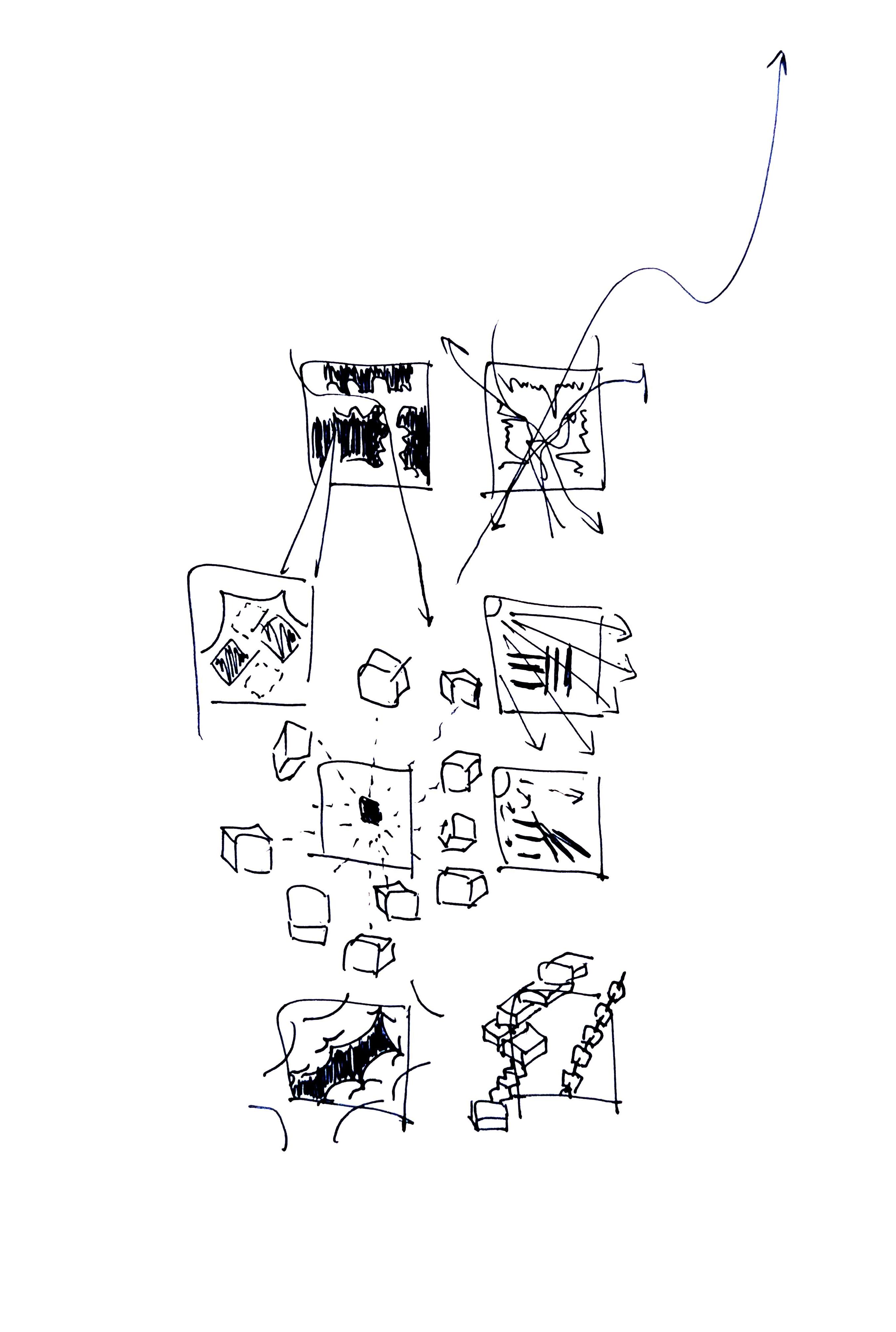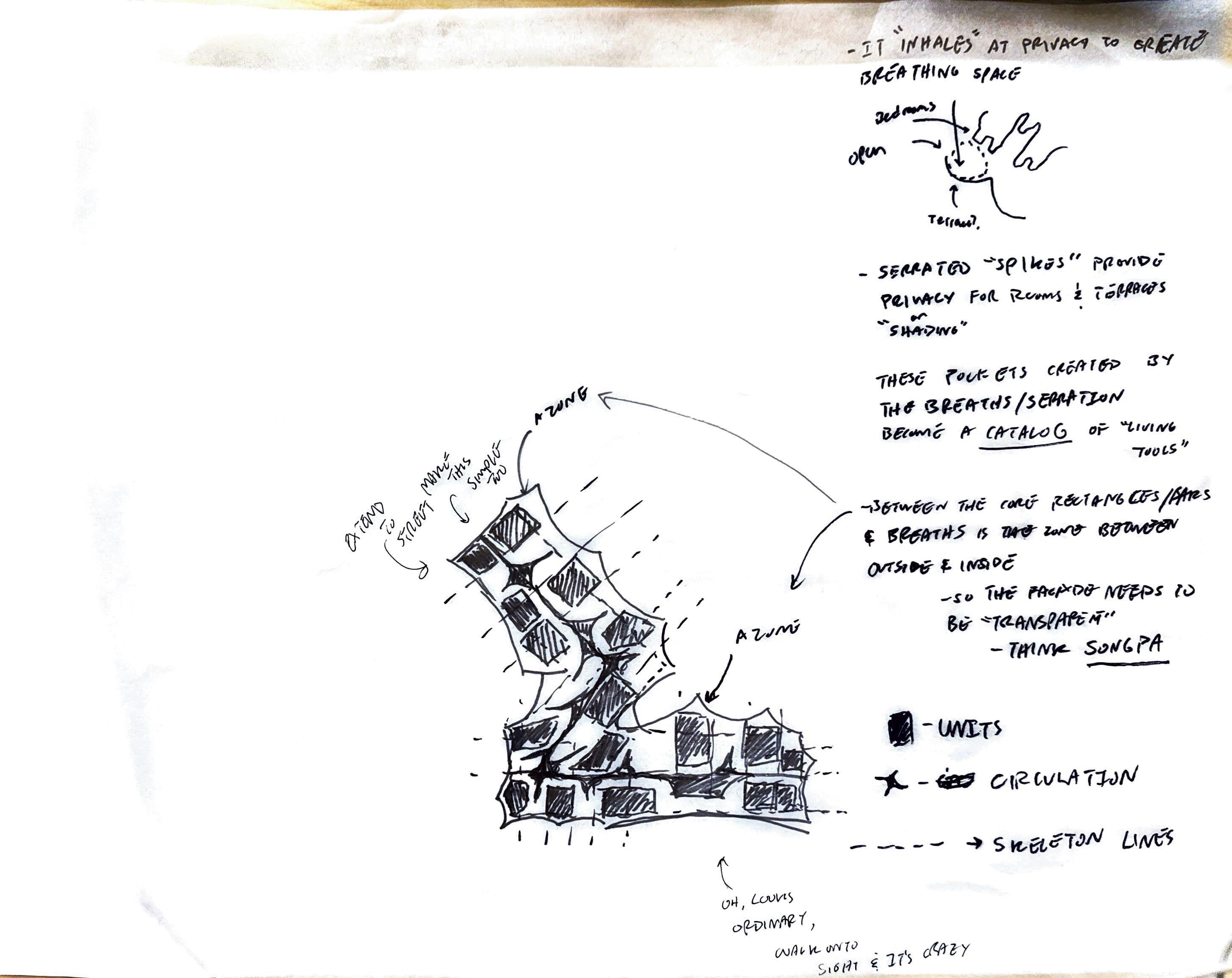 Columns arranged to create a clear path through the plaza. Floor plates protract and retract in relation to the neighbor’s privacy Concept Sketch.