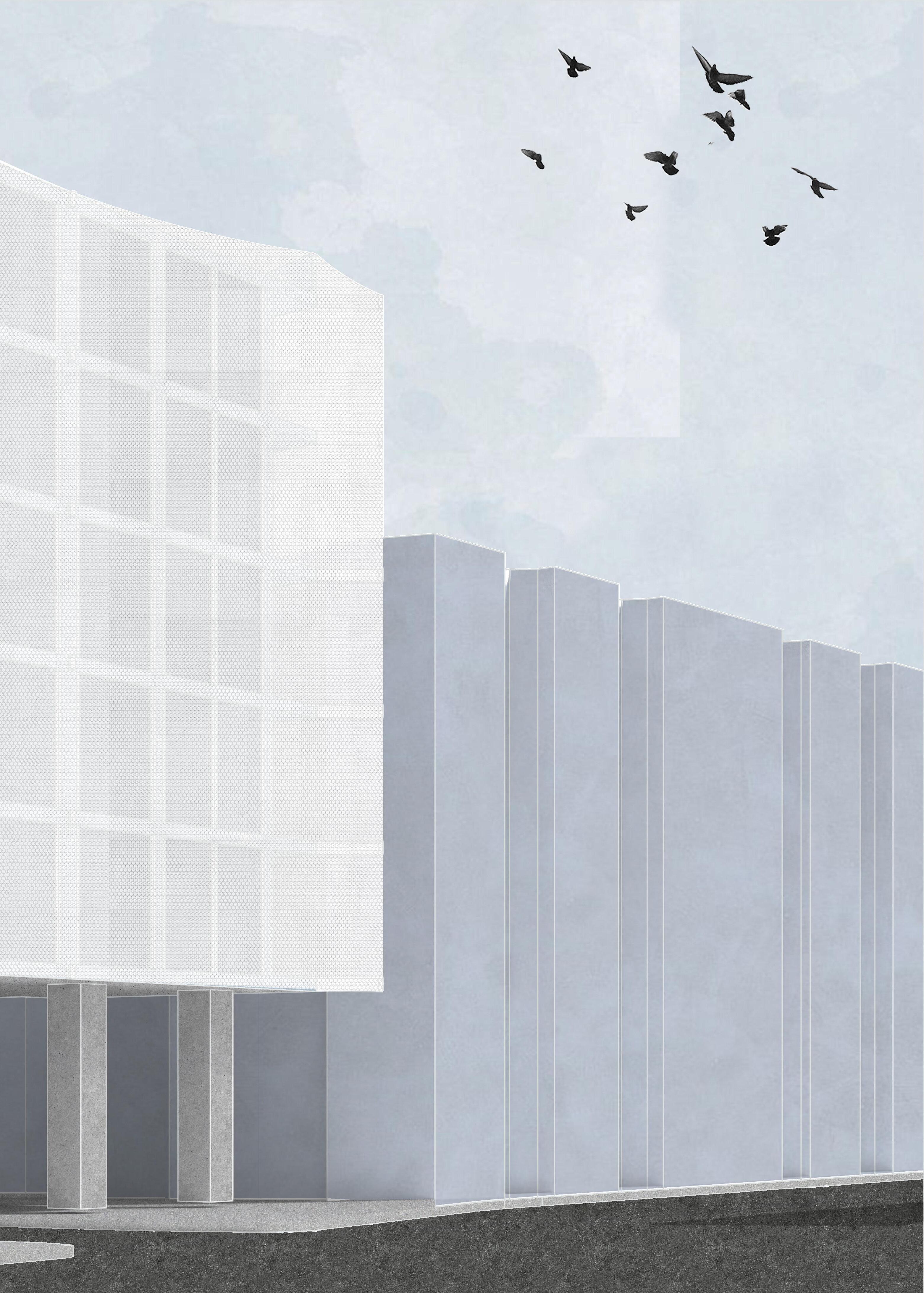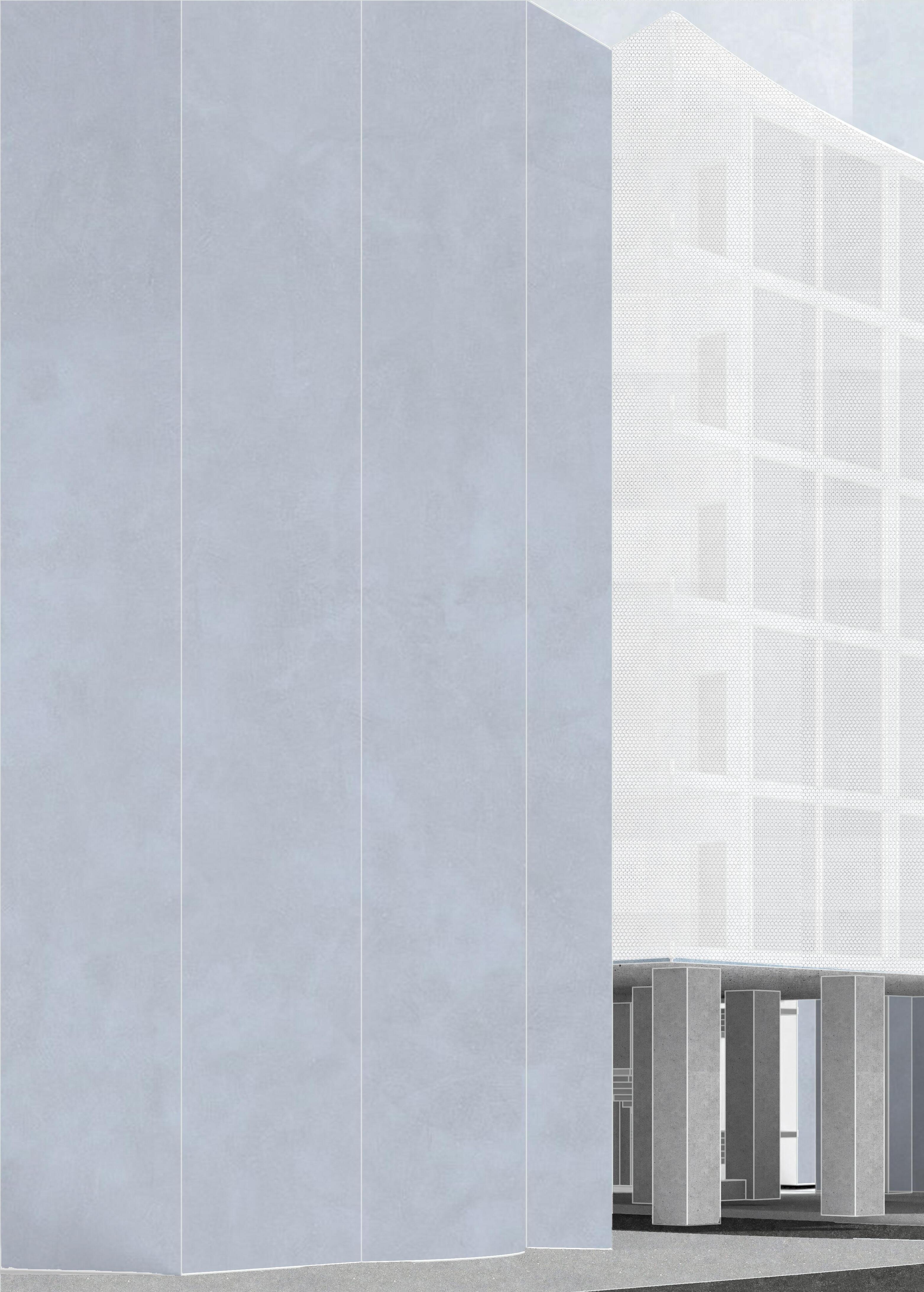 Contrast between maleable mesh and rigid structure, and between open ground-floor plaza, and secluded upper floors