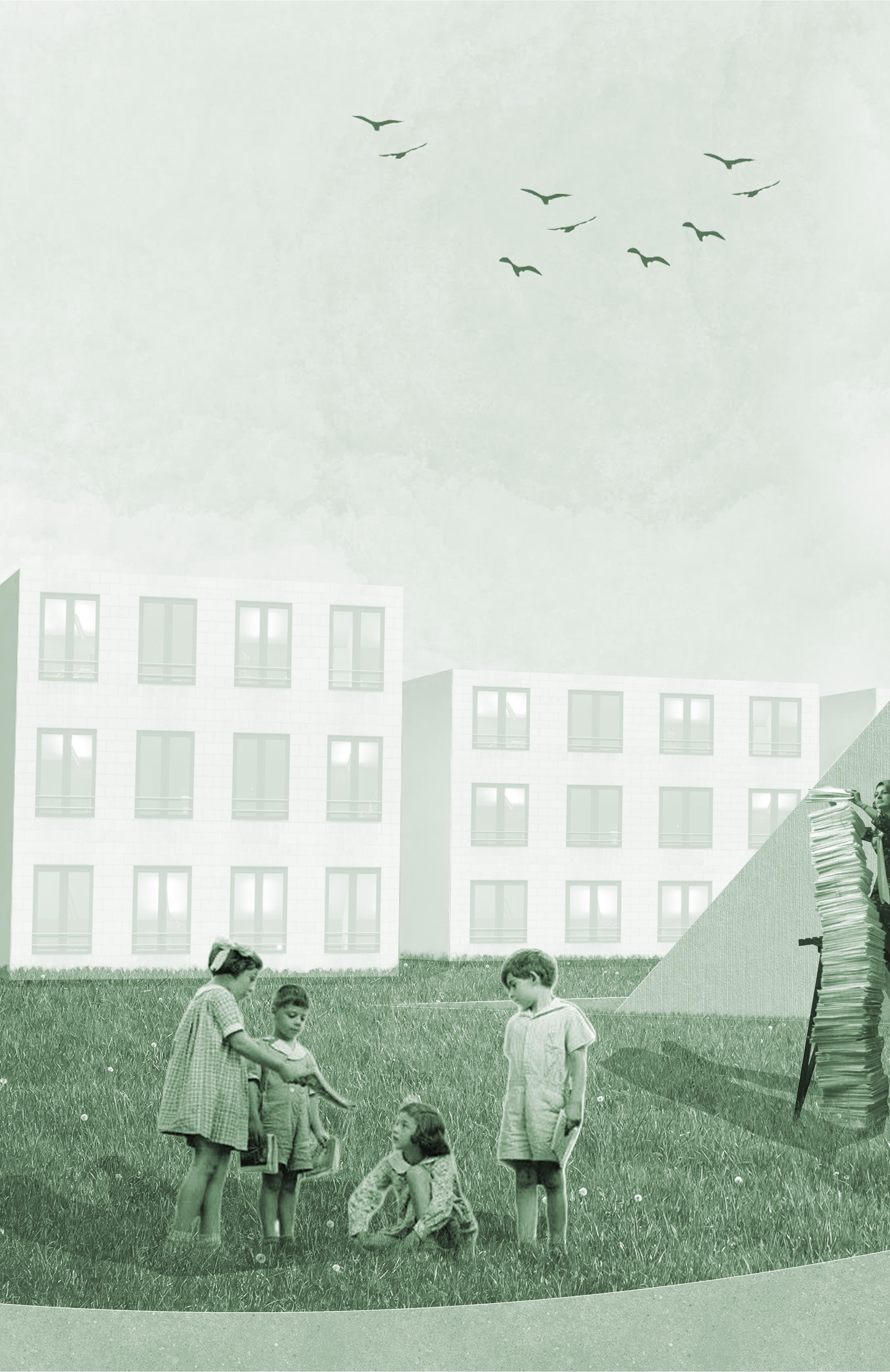 “Gift” Collage. Liminal “gift” spaces typically shared between two-three units, encouraging neighborly engagement and community Plaza Collage. Thin concrete walls vary between elevations to control what is intimate and public
