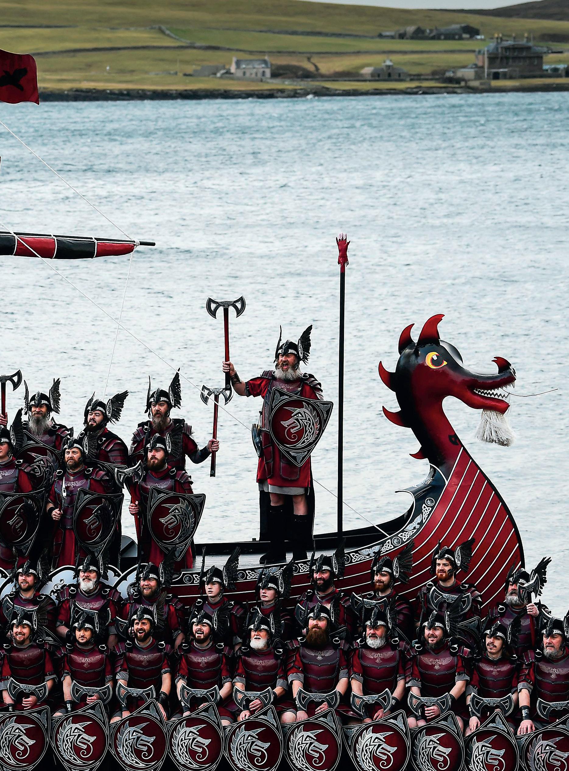 MEMBERS OF THE JARL SQUAD POSE with their Viking galley ship in Lerwick, Scotland, on Jan. 31, before the Up Helly Aa festival later in the day. Up Helly Aa celebrates the influence of the Scandinavian Vikings in the Shetland Islands and culminates with up to 1,000 “guizers” (men in costume) throwing flaming torches into their Viking longboat and setting it alight later in the evening.
