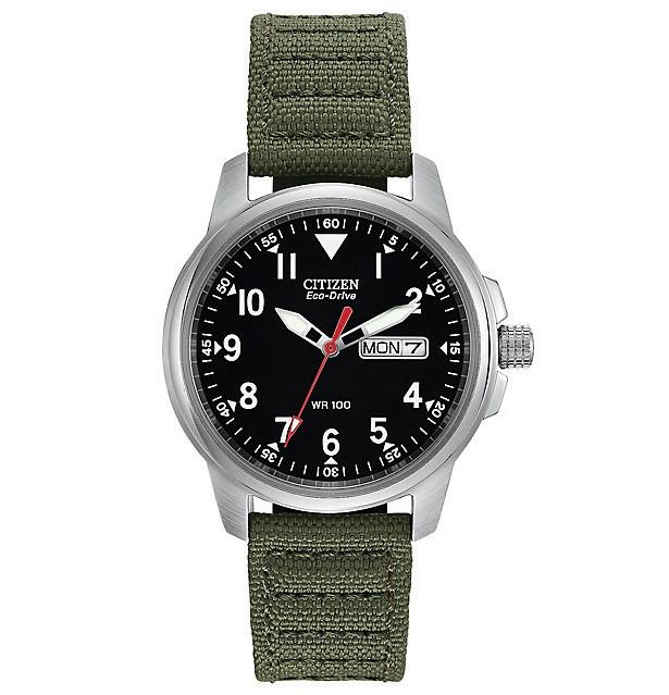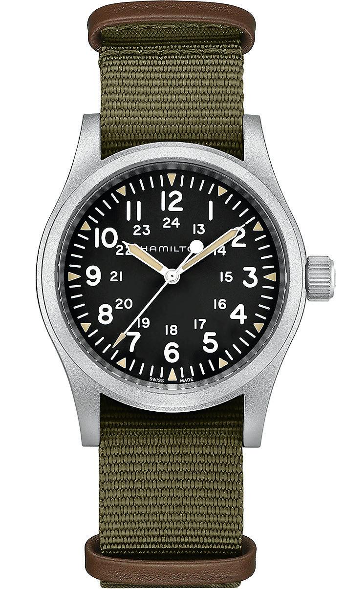 American watchmaker Hamilton put civilian production on hold in 1942 to provide timepieces to the U.S. Army, and this updated model features the same classic, no-frills styling and a modern, self-winding mechanism with an impressive 80-hour power reserve. A stainlesssteel housing provides water resistance to 164 feet, while a nylon strap with leather accents keeps it securely in place.