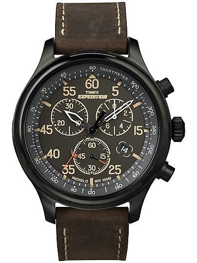 Iconic watchmaker Timex’s approach takes the basic field watch and adds a very practical chronograph function that stands ready to time events to 1/20th of a second. The hefty 43 mm case provides water resistance for the analog quartz movement to depths of 164 feet, while the easy-to-read dial displays the current time as well as elapsed seconds, minutes, and hours.