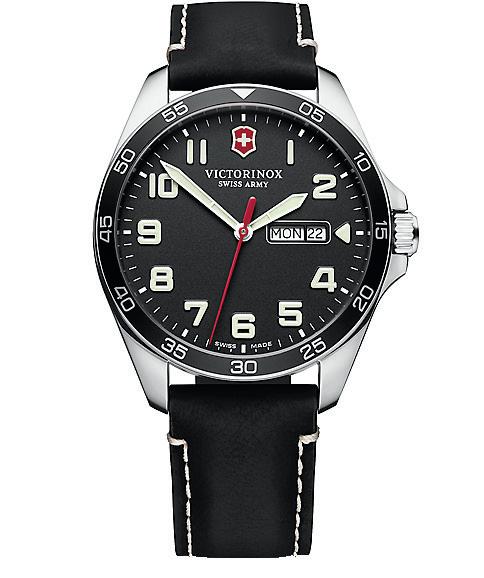 Inspired by the firm’s world-famous multifunction Swiss Army knives, this timepiece starts with a reliable analog movement and then adds a dive watchstyle outer bezel to make it easy to keep track of elapsed time, and a very practical day/date window. The sleek 42 mm case and black leather strap make it a great choice for the beach or the boardroom.