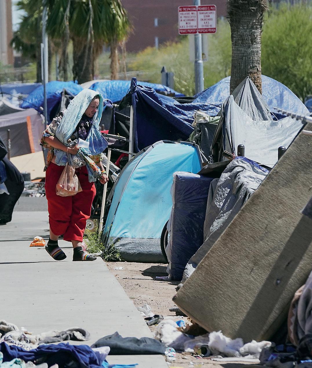 Tents set up by homeless residents in the Zone stand just a few blocks from the Capitol District in downtown Phoenix on April 3.