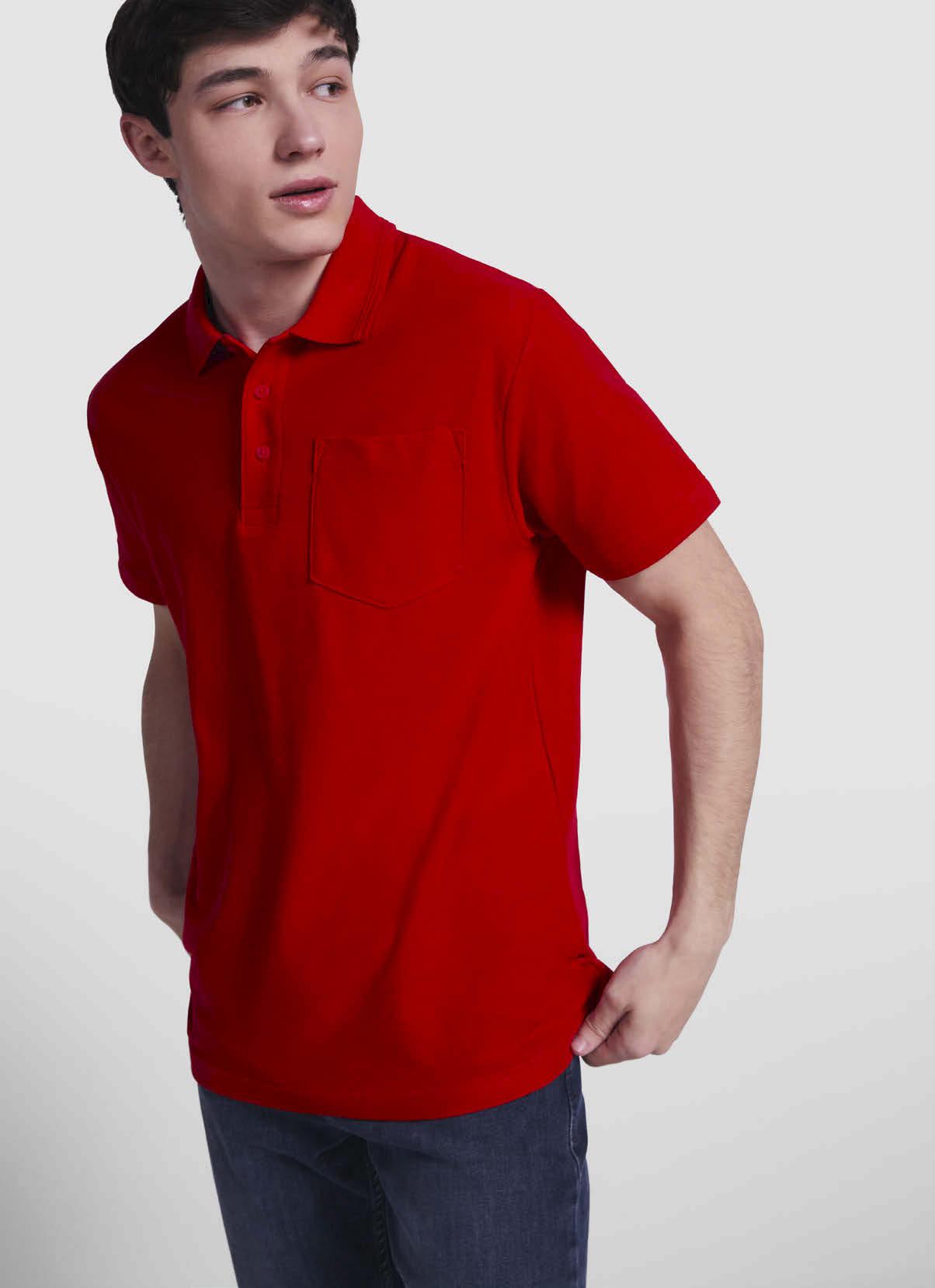 High quality short-sleeve polo shirt in comfortable fabric. 3-button placket. 1x1 ribbed collar and cuffs. Side slits on hem. Pattern of the back slightly longer than the front. Double stitching in shoulders, sleeves and hem of the garment. Optional pocket.