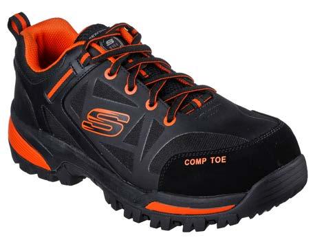 Cette chaussure de randonnée à lacets présente une tige en cuir suédé et en tissu ripstop avec un embout de sécurité composite imperméable et une semelle intérieure rembourrée en mousse à mémoire de forme Skechers Air-Cooled Memory Foam.