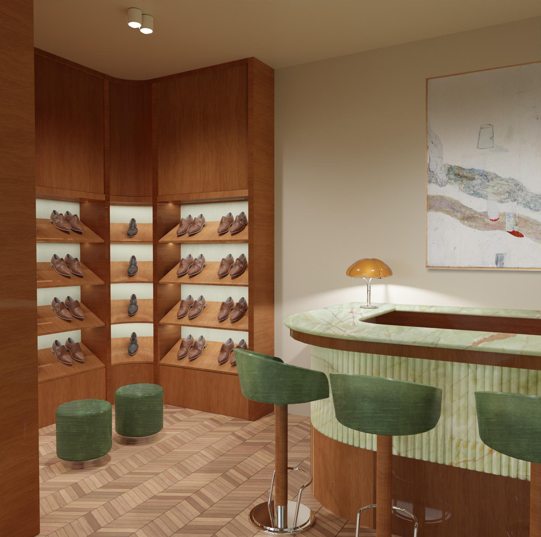 Image above: Ground floor, part of shoe manufacturing is introduced to bespoke area to demonstrate the long lived tradition