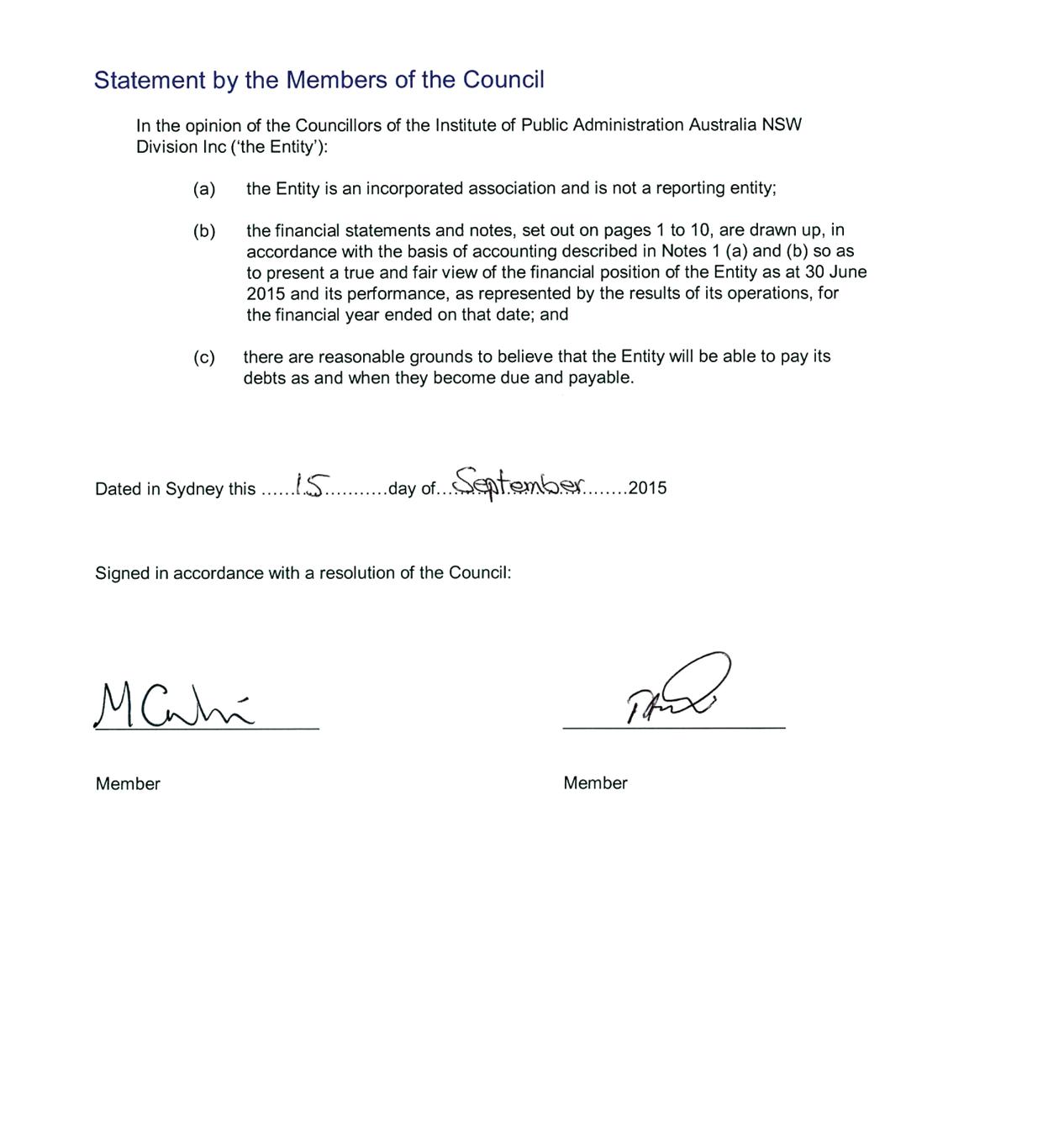 The Institute of Public Administration Australia New South Wales Division Inc. was incorporated in New South Wales on 31 March 1988, under the Associations Incorporation Act 1984 (NSW)(“the Act”). If the Institute is wound up, the Constitution states that each member is required to contribute a maximum of the amount, if any, unpaid by the member in respect of membership of the Institute of Public Administration Australia New South Wales, towards the meeting of any outstanding obligations of the Entity. At 30 June 2015, the number of members was 872 (2014: 905).