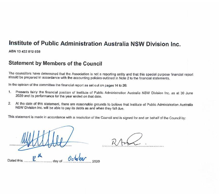 We have audited the accompanying financial report being a special purpose financial report, of Institute of Public Administration Australia NSW Division Inc., which comprises the statement of financial position as at 30 June 2020, the statement of comprehensive income, statement of changes in equity and statement of cash flows for the year then ended, notes comprising a summary of significant accounting policies and other explanatory information, and the statement by members of the council.