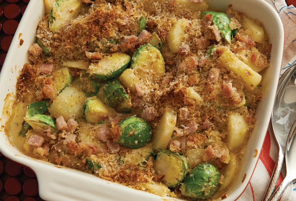 2. Put prepared Brussels sprouts in a shallow baking dish, and pour hot potato mixture over, stirring gently to combine but not break up vegetables. Cover with foil and bake in preheated oven 20 minutes.