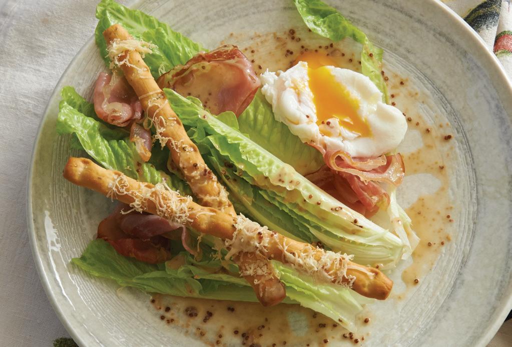 5. Arrange lettuce on 4 plates; tuck prosciutto amongst lettuce and place egg alongside; add dressing and parmesan grissini.