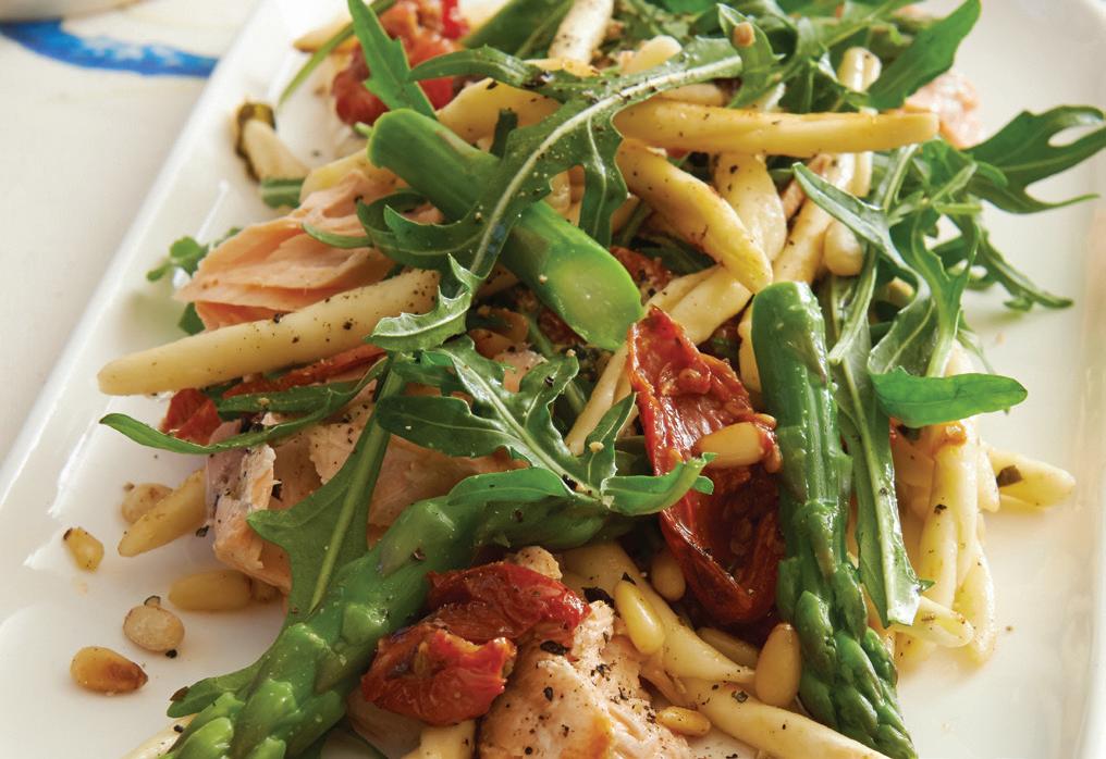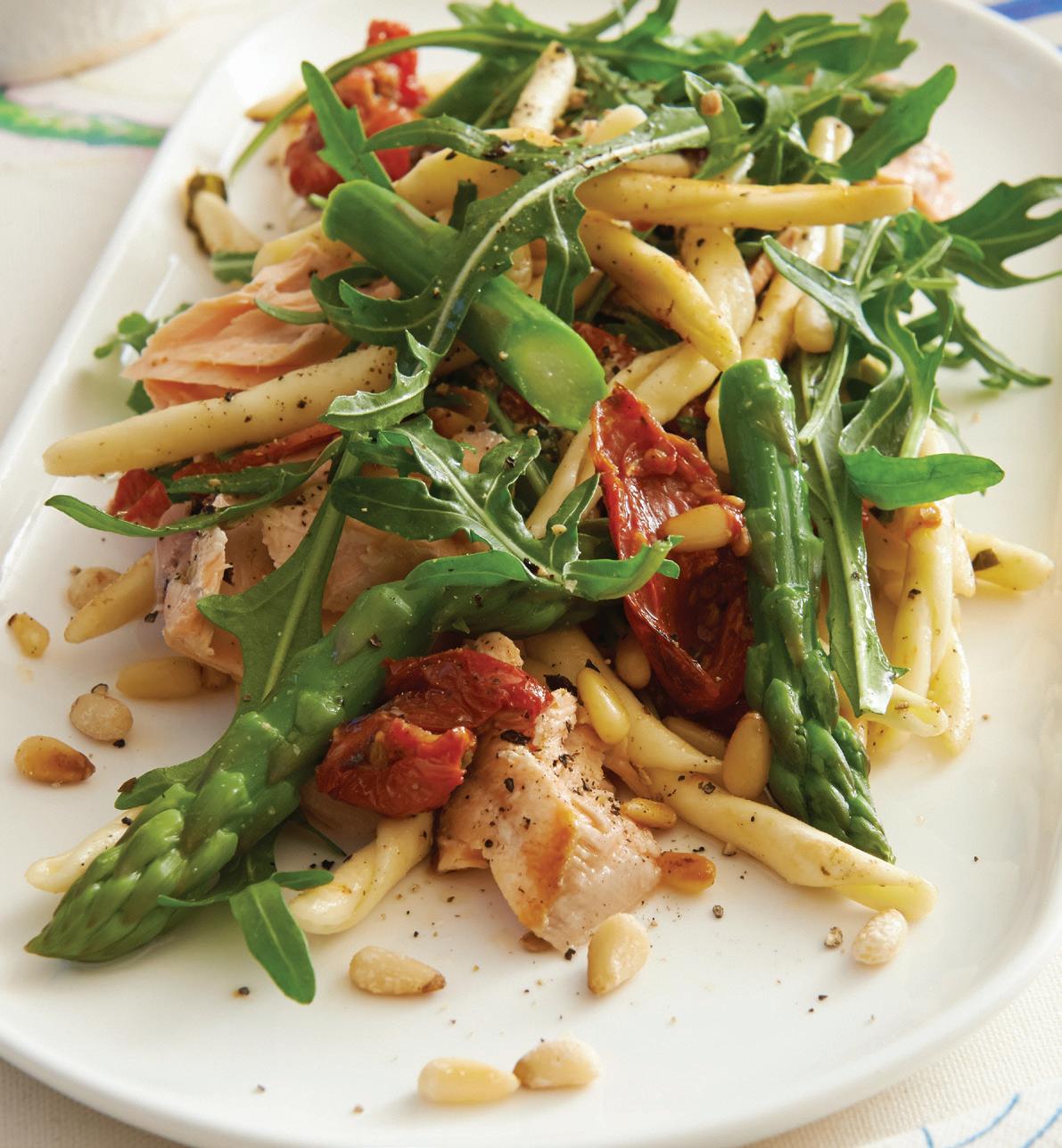 5. Drain pasta and transfer to frypan. Stir through crème fraiche (or sour cream) and parmesan, and season with salt and pepper. Add asparagus, salmon, semi-dried tomatoes, pine nuts and rocket and toss through pasta.