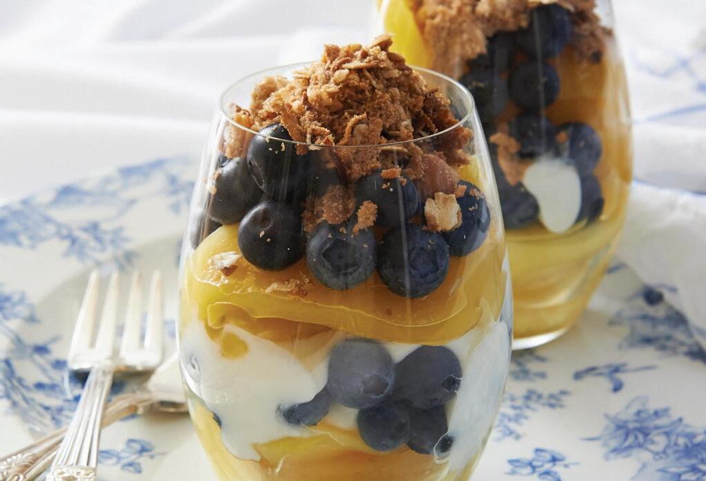 4. Build dessert into 4 individual glasses or bowls to show off layers of ingredients. Place 2 slices of mango into base of each glass; top with layers of half of blueberries, all of yoghurt, and another layer of mango and blueberries; and finish off with warm crumble.