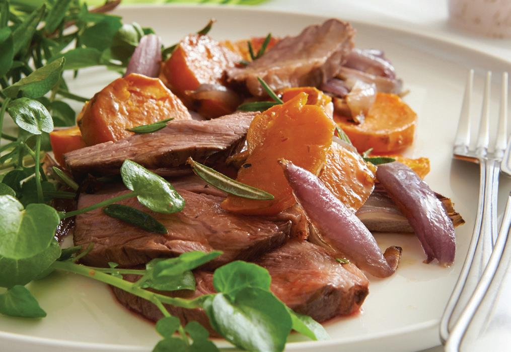 1. Preheat oven to 200°C. In a large bowl, whisk marinade ingredients together and toss through sweet potatoes and onions. Leaving some of marinade in bowl for lamb, remove vegetables and spread out on baking tray/s lined with baking paper. Roast 15 minutes.