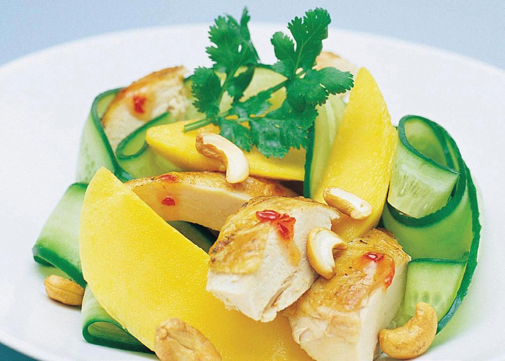 1. Divide up the barbecued chicken into portions and arrange onto serving plates with the mango quarters and sliced cucumbers.