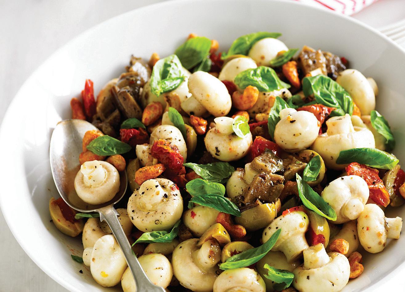2. Just before serving, add olives, tomatoes, eggplant, basil and cashews and toss gently to combine. Spoon into large bowl, season with salt and pepper and serve with turkey, ham or pork.