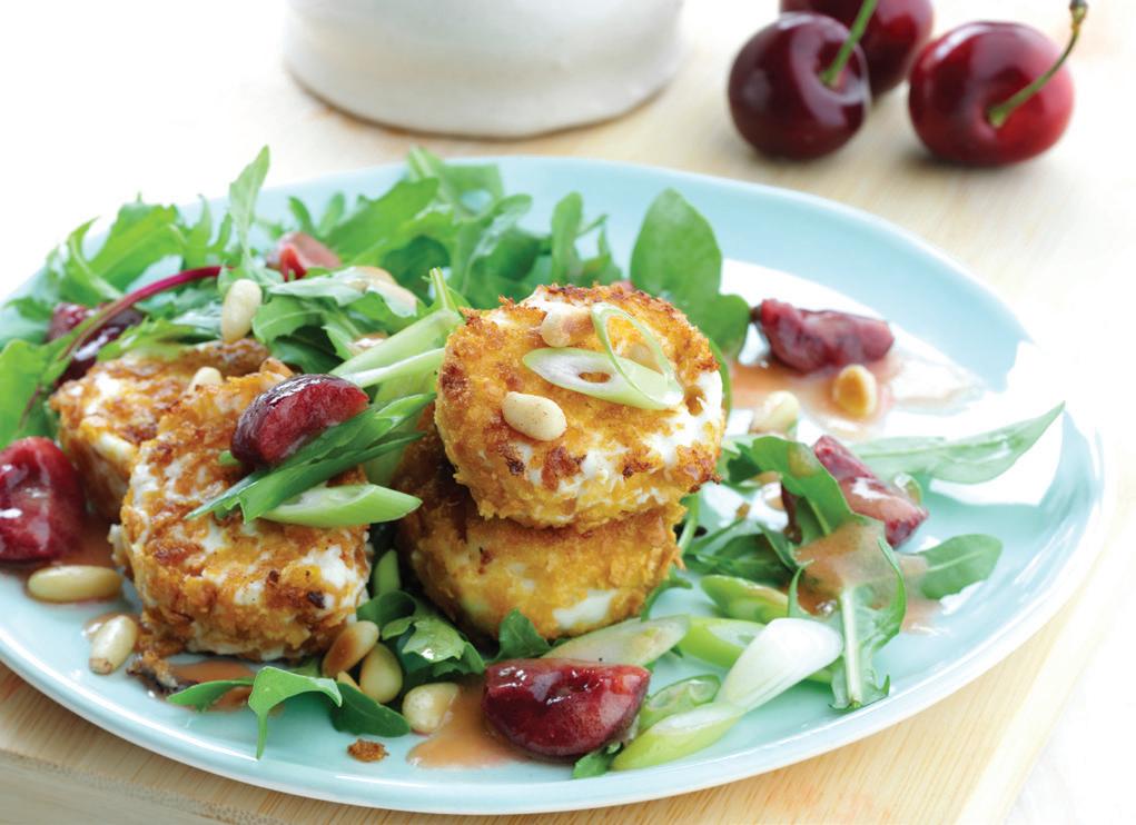 1. To make dressing: Whisk together olive oil, vinegar and mustard in a bowl. Season with salt, pepper and sugar, stir through cherries and set aside. Rinse rocket and spin dry.