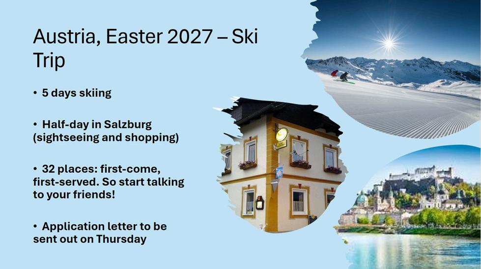 We are delighted to announce the 2027 St Teresa’s ski trip will be taking place in Austria. All pupils from current Year 7-10 are welcome.