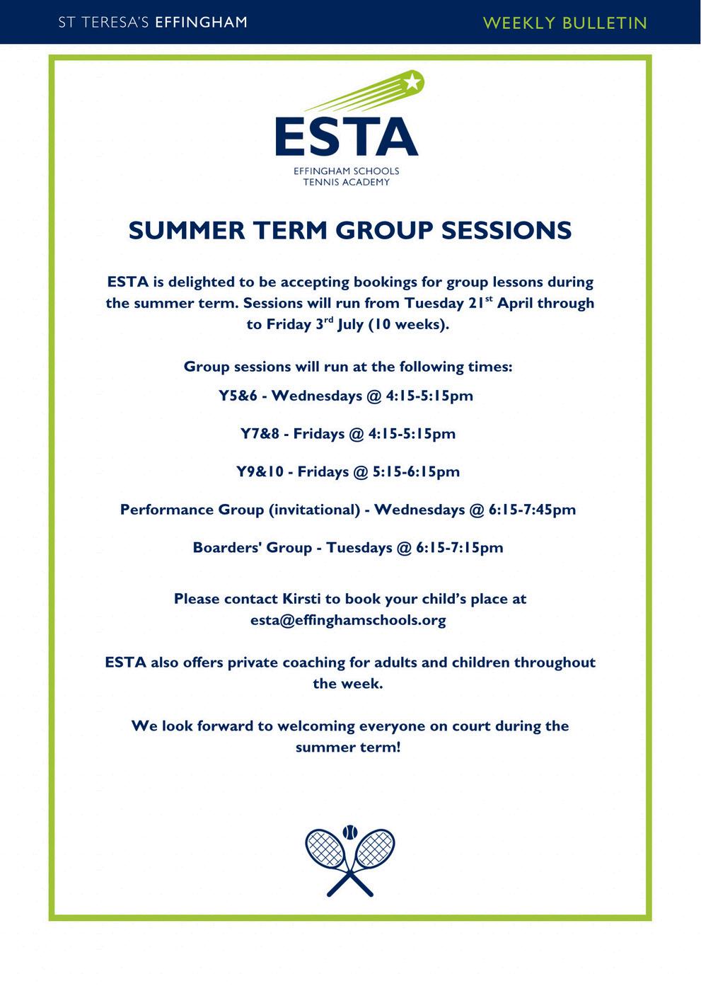 Our Easter tennis camp will run for 4 days from Monday 30 March to Thursday 2 April at St Teresa's. The timings are as follows: th nd