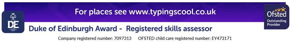 Nick and Sarah Holt, Typing’s Cool Ltd, School House, St Joseph’s Primary School, Kingston KT1 2UP 07812 632238; sarah.holt@typingscool.co.uk; OFSTED reg no. EY473171; www.typingscool.co.uk