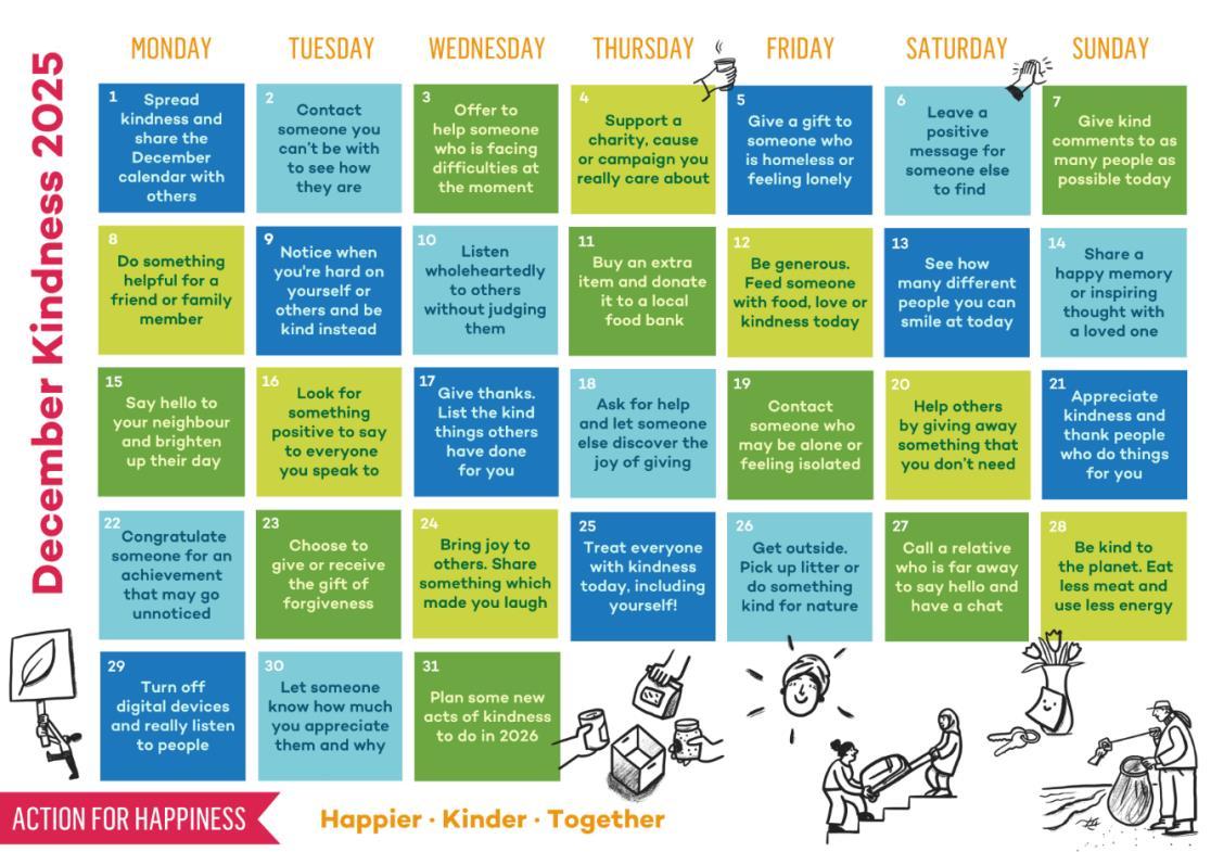 To help us achieve being like Jesus, which he very helpfully outlined for us in two simple steps (ONE: Love the Lord Your God with ALL your heart, sould, mind, and strength; TWO: love your neighbour as yourself), let’s get active with this month’s Action For Happiness calendar: December Kindness.