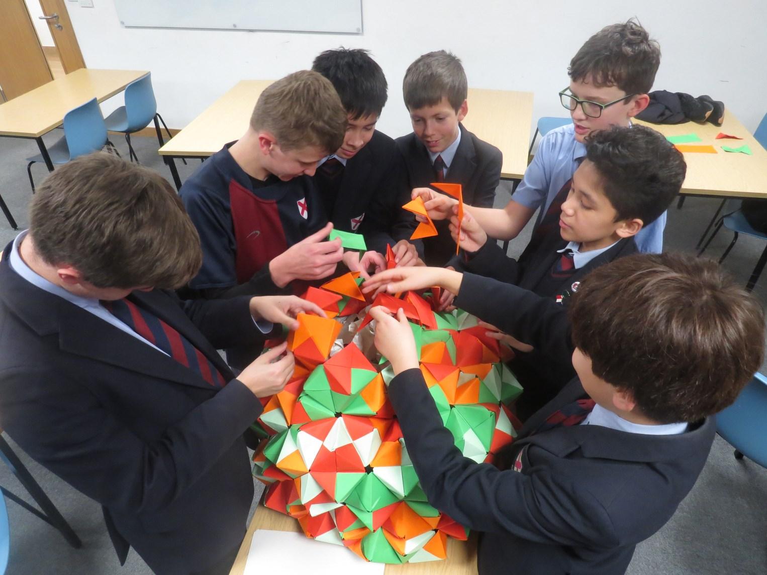 Our Maths Club embarked on an ambitious Christmas project during this half of the term: producing an ‘Epcot ball’ (or a truncated icosahedron, for those in the know!). The origami project required 270 individually folded pieces, which were slotted together to create a giant bauble-shaped sphere. They should be very proud of their precision and teamwork!