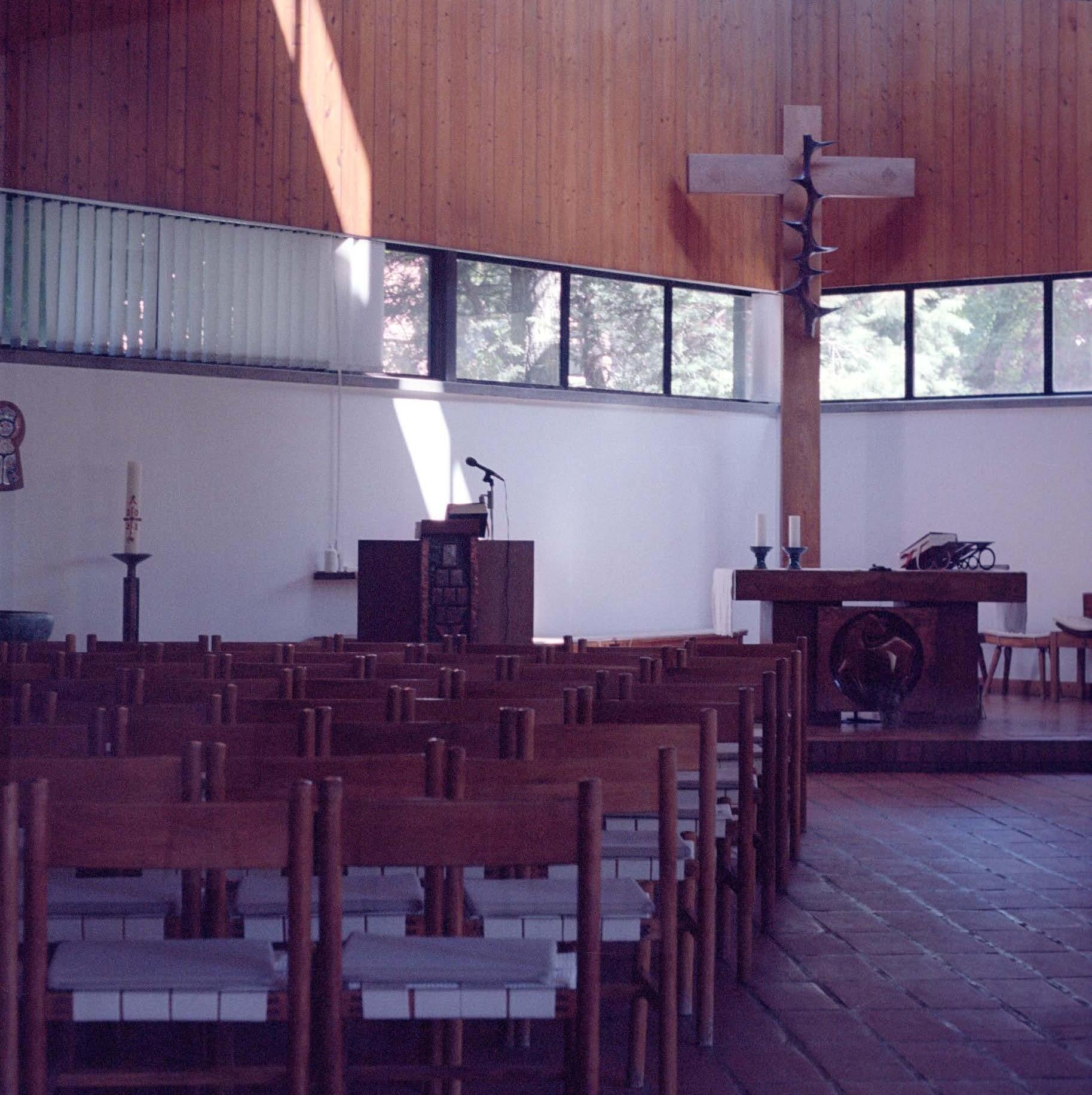 Ezen túl, a belső tér természetes megvilágítását a téglafalon körbefutó szalagablakok biztosítják. A templom minden részén megfigyelhető ez a visszafogott zártság, mely a kívülről történő betekintéstől véd, majd egy bizonyos magasságban különböző kialakítású üvegfelületekkel megtörik - beengedve ezzel a fényt és láttatva a külvilág évszakonként változó lombkoronáit.
