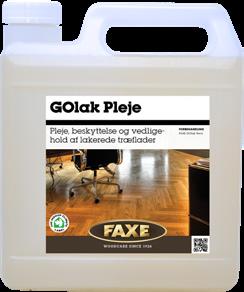 FAXE GOlak Pleje, er specielt udviklet til rengøring, pleje, beskyttelse og vedligehold af lakerede træoverflader. Produktet indeholder ingen opløsningsmidler og er en vandbaseret, miljørigtig lakpleje.