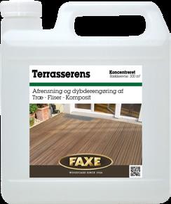 FAXE Terrasserens Koncentreret er egnet til rengøring af terrassebelægninger lavet af ubehandlet eller olieret træ, sten eller kompositmateriale. FAXE Terrasserens fjerner belægninger og forhindrer deres hurtige nydannelser.