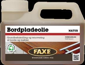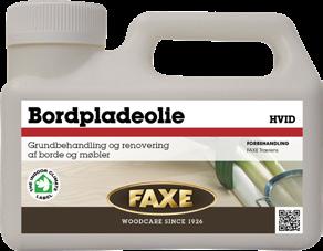 FAXE Bordpladeolie er specielt udviklet til nem grundbehandling, renovering og pleje af bordplader, møbler o. lign. der skal være vandafvisende og slidstærke. FAXE Bordpladeolie er på basis af rene naturolier. Bruges på ubehandlet eller ludbehandlet træ, på bordplader, møbler m.m. hvor man ønsker at give træet en smuk gylden glød med FAXE Bordpladeolie Natur eller en smuk hvidskuret overflade med FAXE Bordpladeolie Hvid.