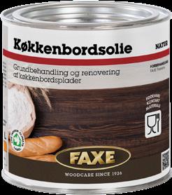 FAXE Køkkenbordsolie er specielt udviklet til nem grundbehandling, renovering og pleje af træoverflader, der skal være vandafvisende og slidstærke. Produktet er på basis af rene naturolier. FA XE Køkkenbordsolie leveres i forskellige farver: Natur, Hvid, Sort, Drivtømmer Grå og Mahogni.