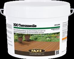 FAXE H2O Terrasseolie er en vandfortyndbar træolie på basis af naturlige olier. Produktet indeholder UV-beskyttelse. FAXE H2O Terrasseolie anvendes til behandling og renovering af rengjorte træterrasser og havemøbler af træ og beskytter mod vejrliget og giver træet en vandafvisende overflade. Samtidig bibeholdes træets naturlige glød og farve.