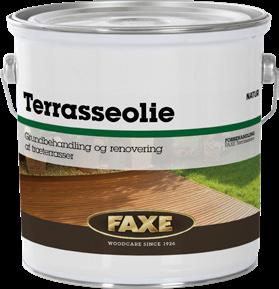 FAXE Terrasseolie bruges til behandling og pleje af rene træterrasser. Olien beskytter mod ældning og blegning, samtidig med at træets naturlige struktur og åretegning bevares. Den indeholder effektive pigmenter, UV-beskyttelse og er meget slidstærk.