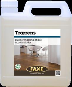 FAXE Trærens er et miljøvenligt produkt til grundrengøring af træ inden behandling med lud, sæbe eller olie. Indeholder hverken opløsningsmidler, parfume eller farvestof.
