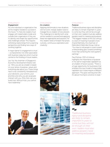 CHALLENGE 5 Purpose Traditional business rigour and discipline are likely to remain important in years to come but they will not be enough on their own; leaders must also address people’s need for meaning and purpose. “The biggest malaise of the 21st century is a lack of meaning in people’s lives,” Anand Mahindra, the chairman of Mahindra & Mahindra Group, told us. “You have to tell people to work toward a transcending goal, toward something more than achieving the next quarter’s earnings.” Paul Polman, CEO of Unilever, highlights the importance of purpose in his call for responsible capitalism as an enabler of future success. “There is a huge opportunity for businesses that embrace this new model of responsible capitalism but it does require a different approach. This goes well beyond CSR. It’s about moving to a licence to lead .”