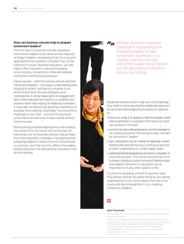 If business schools want to step up to this challenge, they need to move beyond the traditional classroom environment and burgeoning business of webinars to: • focus on what it is going to take for leaders (and their businesses) to succeed in the future not what has worked in the past • move from providing lecturers on knowledge to co-creating answers that are personally relevant for tomorrow’s leaders • view education not as a series of episodic events that provide answers but as a continuous process of learn-understand-co-create-apply-learn • understand that preparing tomorrow’s leaders is a human process. The world is becoming more complex, ambiguous and connected. Relationships and support networks in education are as important as in any other sphere of life. It is time for business schools to practise what they preach and do the same thing we are asking organisations to do. Come down from the ivory tower and become partners in co- creating tomorrow’s leaders.