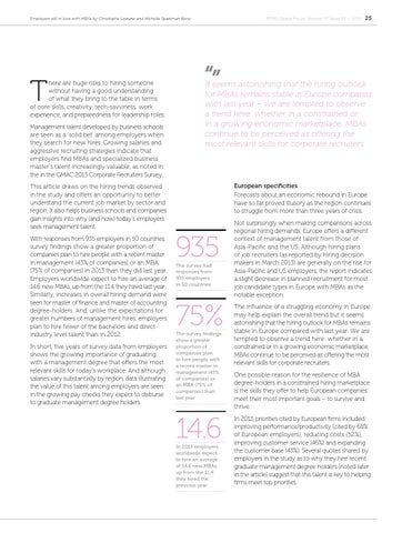 This article draws on the hiring trends observed in the study and offers an opportunity to better understand the current job market by sector and region. It also helps business schools and companies gain insights into why (and how) today’s employers seek management talent. With responses from 935 employers in 50 countries, survey findings show a greater proportion of companies plan to hire people with a recent master in management (43% of companies) or an MBA (75% of companies) in 2013 than they did last year. Employers worldwide expect to hire an average of 14.6 new MBAs, up from the 11.4 they hired last year. Similarly, increases in overall hiring demand were seen for master of finance and master of accounting degree-holders. And, unlike the expectations for greater numbers of management hires, employers plan to hire fewer of the bachelors and directindustry level talent than in 2012. In short, five years of survey data from employers shows the growing importance of graduating with a management degree that offers the most relevant skills for today’s workplace. And although salaries vary substantially by region, data illustrating the value of this talent among employers are seen in the growing pay checks they expect to disburse to graduate management degree holders.