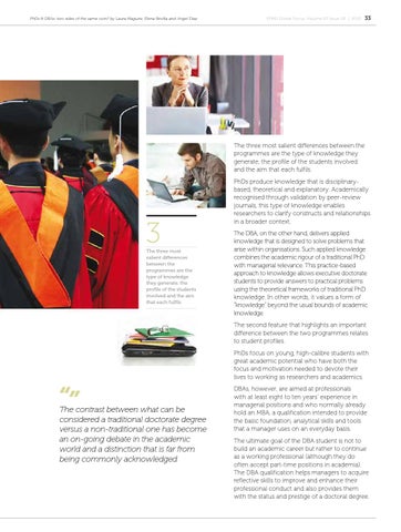 PhDs produce knowledge that is disciplinarybased, theoretical and explanatory. Academically recognised through validation by peer-review journals, this type of knowledge enables researchers to clarify constructs and relationships in a broader context. The DBA, on the other hand, delivers applied knowledge that is designed to solve problems that arise within organisations. Such applied knowledge combines the academic rigour of a traditional PhD with managerial relevance. This practice-based approach to knowledge allows executive doctorate students to provide answers to practical problems using the theoretical frameworks of traditional PhD knowledge. In other words, it values a form of “knowledge” beyond the usual bounds of academic knowledge. The second feature that highlights an important difference between the two programmes relates to student profiles. PhDs focus on young, high-calibre students with great academic potential who have both the focus and motivation needed to devote their lives to working as researchers and academics.