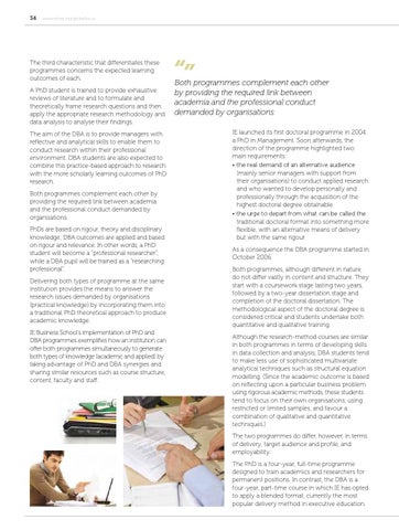 Both programmes complement each other by providing the required link between academia and the professional conduct demanded by organisations IE launched its first doctoral programme in 2004, a PhD in Management. Soon afterwards, the direction of the programme highlighted two main requirements: • the real demand of an alternative audience (mainly senior managers with support from their organisations) to conduct applied research and who wanted to develop personally and professionally through the acquisition of the highest doctoral degree obtainable • the urge to depart from what can be called the traditional doctoral format into something more flexible, with an alternative means of delivery but with the same rigour As a consequence the DBA programme started in October 2006. Both programmes, although different in nature, do not differ vastly in content and structure. They start with a coursework stage lasting two years, followed by a two-year dissertation stage and completion of the doctoral dissertation. The methodological aspect of the doctoral degree is considered critical and students undertake both quantitative and qualitative training. Although the research-method courses are similar in both programmes in terms of developing skills in data collection and analysis, DBA students tend to make less use of sophisticated multivariate analytical techniques such as structural equation modelling. (Since the academic outcome is based on reflecting upon a particular business problem using rigorous academic methods, these students tend to focus on their own organisations, using restricted or limited samples, and favour a combination of qualitative and quantitative techniques.) The two programmes do differ, however, in terms of delivery, target audience and profile, and employability. The PhD is a four-year, full-time programme designed to train academics and researchers for permanent positions. In contrast, the DBA is a four-year, part-time course in which IE has opted to apply a blended format, currently the most popular delivery method in executive education.