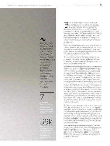 ack in 2007 Robert Sutton, professor of management science at the Stanford Engineering School in America and a researcher in the field of evidence-based management, wrote an award-winning if rather explicitly titled book (The No A**hole Rule: Building a Civilized Workplace and Surviving One That Isn't) explaining how workplace bullying and other misdemeanours can destroy morale and productivity. No one is suggesting that management school faculty and staff are as bad as that but it is often the case that our industry has a reputation for not ourselves following the organisational advice we so lavishly bestow on others. If we are to overcome this poor image of our profession, it is vital that we address this issue – and the human resource (HR) department of a school can play a key role. Most business/management schools and similar institutions have HR departments but their role is often confined to organising occasional training programmes and preparing the odd document for validation committees. HR needs to be much more than that and at Grenoble EM in France we have made a great effort over the past few years to bring HR into the heart of managing the school. It is an attempt to have a much more proactive organisation in managing people’s expectations and careers and providing greater opportunities for staff mobility. This strategy, it is felt, increases well-being within the organisation, reduces staff turnover and improves overall efficiency. In fact, the school has a very low absentee rate and staff stay for an average of seven years, which is quite high for the sector. Senior management has tried to set the tone for this. For several years, the motto of the school has been that it is our role to make Grenoble EM “an exceptional place to exercise our profession”. In a healthy working environment, people will naturally want to take on projects and will not need to be controlled. Some estimates even suggest that motivated staff will work three times as hard as demotivated ones. This is not unique to higher education. Vineet Nayar, vice-chairman and joint managing director of leading India-based IT company HCL, is convinced of this. With a global workforce of 55,000 the company’s motto is “employee first, customer second”.