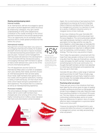 International mobility Management schools have been very active in encouraging international mobility for students and staff. And this has led to massive increases in international teaching and research over the past 20 years. However, some management staff have been left behind in this development. Hence Grenoble EM has introduced a policy encouraging individual staff members to spend at least a week abroad every year at one of the school’s international partners. The HR department and the Centre for International Affairs select a number of candidates each year, identify their needs, and then choose an international partner that can best satisfy those needs. Staff members then spend one to two weeks with the partner institutions, meeting a variety of staff and faculty. On their return they write a short report and give a presentation on their experience. This ensures that it is a collective as well as an individual learning experience. Promotion mobility The school believes strongly in internal promotion. Nearly half of current staff members have changed jobs since arriving at the school. This is highly motivating since it offers a clear indication that hard work and initiative will be rewarded.